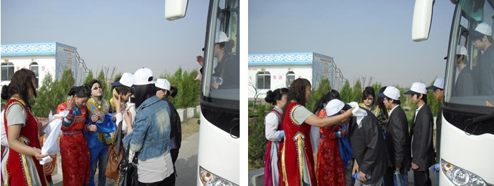 窩闊臺沙漠旅游景區(qū),迎接我們的是熱情的蒙古儀式下馬酒、敬獻哈達。在嘹亮的祝酒歌聲中所有員工都非常豪爽的干掉碗中的酒,由美麗大方的蒙古族姑娘獻上潔白的哈達。